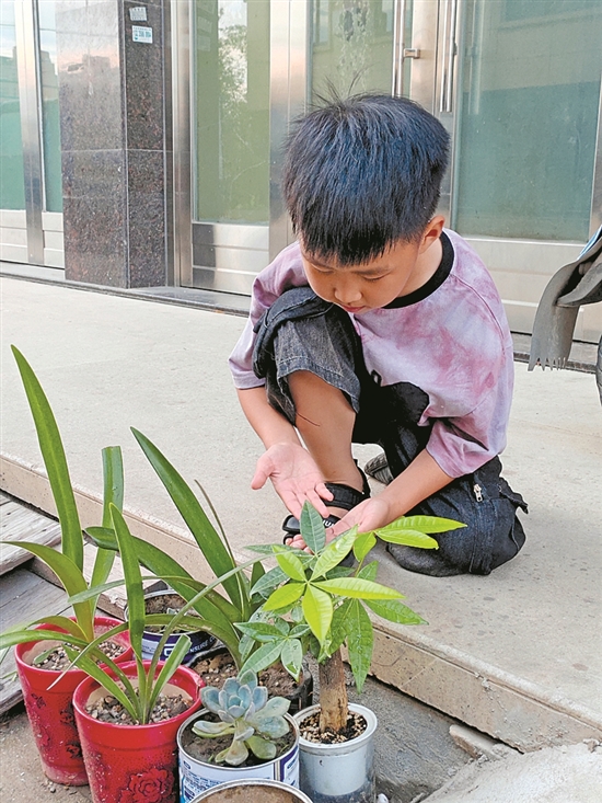我蹲(dūn)在院子里,正紧紧盯着我种的发财树的树叶,它随着风轻轻摇摆,我忍不住抚摸了它一下,它仿佛露出了笑容一般。我看向旁边的多肉,和刚种下去时对比,似乎大了一圈,我又陷(xiàn)入了沉思,多肉的叶片会脱落吗?脱落了可以接回去吗?这些问题在我的脑海里疯狂乱转。突然,我看见了一旁的小草!这株小草格外的嫩!我好喜欢它,我一定要好好呵护它!我给它浇了一点水,希望它快快长大!