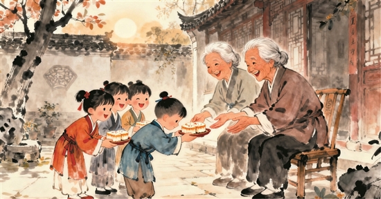 吃重阳糕:盼老人健康 “步步高”。