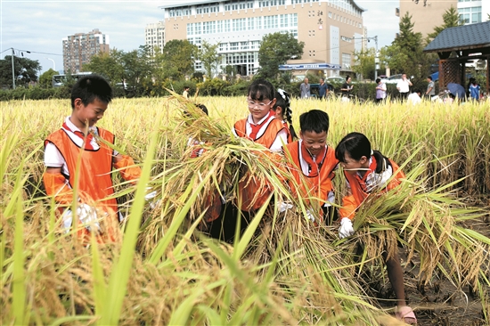 随后,学生们分组深入稻田开展收割作业。虽然动作略显生疏,但学生们个个神情专注。随着汗水浸湿衣衫,此起彼伏的欢笑声在田野间回荡。“通过这次实践,我真正理解了粮食的来之不易。”潘郎小学学生徐昱昕说。