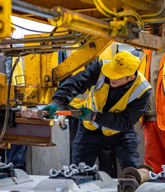 “由于桥隧密集、工作面狭窄,传统大型铺轨机组难以施展。”温玉铁路铺轨负责人栾兴军介绍,“我们创新采用‘推送拖拉法’,并配套低矮紧凑型专用铺轨设备,在铺轨起点布设长钢轨拖拉装置,将长轨从运输车直接推送至桥面或隧道底板,同步完成布轨、焊接、锁定等工序,实现‘一条龙’作业。”施工过程中,精密测量系统与铺轨机组实时协同,确保每一段钢轨铺设的精度与安全。