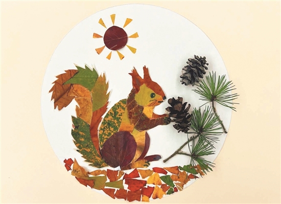 创作手记:我把捡来的落叶,拼贴成了一只小松鼠。金黄的、橙红的、深棕的、黄绿的叶子,变成了它毛茸茸的身体。秋日的午后,小松鼠捧着松果,准备细细品味。