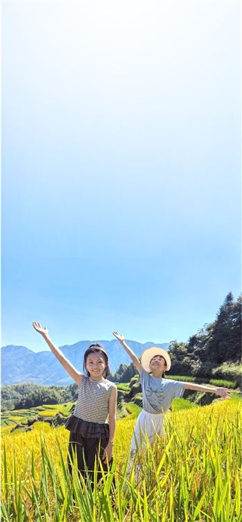 我们迫不及待地冲进梯田,脚下是松松软软的泥土,带着大地的温热与湿润;身边的稻穗金黄金黄,轻轻拂过脸颊,留下淡淡的稻香。我们在田埂上肆意奔跑、嬉戏,欢声笑语穿透稻浪,回荡在山谷之间。玩累了,便席地而坐,静静地看着阳光在稻穗上流转,看着远处的山峦在云雾中若隐若现,任时光在这份惬意中缓缓流淌。