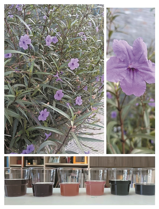 最神奇的是,蓝花草还是一位“魔术师”呢!如果你摘几朵蓝花草,轻轻捣(dǎo)碎,就能得到紫色的汁液。你猜怎么着?当我们把汁液分到两个杯子里,一个杯子滴入白醋,紫色的汁液一下子就会穿上粉红色的衣裳!另一个杯子加入一些洗洁精水,它又会立刻变成翠绿色,就像施了魔法一样!