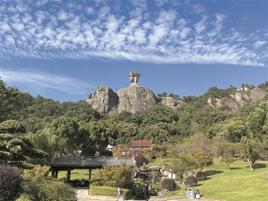 山下树叶茂盛,红的、黄的、绿的、褐色的,色彩斑斓,美丽极了。山上有一块巨石,好像悬在空中,宛(wǎn)如一位夫人抱着孩子眺望远方,这就是有名的石夫人山。