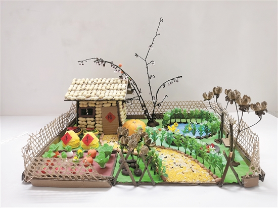 作品说明:秋天是一个丰收的季节,它将丰盛的果实馈赠予我们,我用花生、稻谷、棉花壳结合超轻黏土做一个漂亮的小院子,看着它们变成漂亮的手工,就像秋天的馈赠有了新生命,我好开心呀!