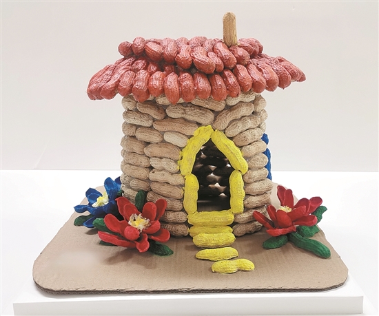 作品说明:秋天是收获的季节,它给我们带来了许多美味的食物。例如花生,看着这些剩下的花生壳,我想给它们新生命!我用花生做小房子的墙和屋顶,还把花生涂成彩色,做成小花和门。我看着小屋美美的、香香的,特别开心!
