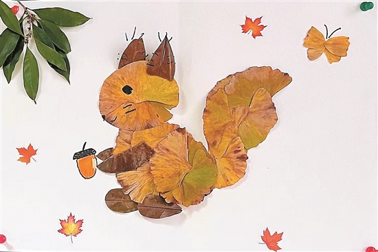 这幅树叶贴画巧妙地利用了大自然的馈赠。用不同形状和颜色的落叶,拼贴出一只可爱的小松鼠。它翘着毛茸茸的大尾巴,正用前爪抱起一颗饱满的松果,动作憨态可掬。作品生动地捕捉了森林中的灵动瞬间,展现了树叶在巧思下焕发的新生命,将秋日的森林故事定格在这方寸之间,充满了自然之美与创造的乐趣。
