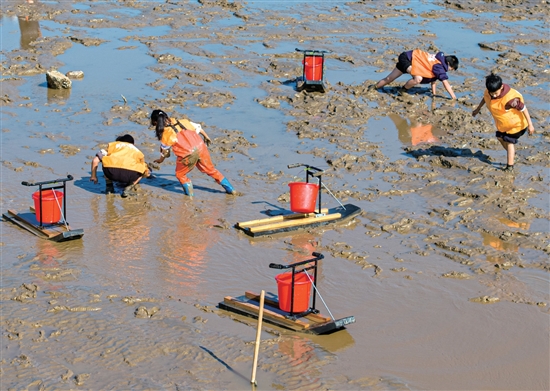 11月15日,在石桥头镇沙角村,孩子们在家长和指导老师的陪伴下,在滩涂上驾驶泥马船,学习辨认蟹、贝等潮间带生物,享受柔软泥巴带来的奇妙感受,在丰富滩涂文化知识的同时,尽情感受与大自然亲密接触的乐趣。