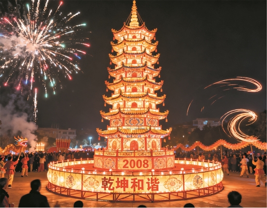 这盏花灯诞(dàn)生在清朝,已经活了300多岁啦!它长得像座漂亮的宝塔,有七层那么高,还分“龙灯”和“凤灯”,龙灯威(wēi)武、凤灯柔美,贴满了五颜六色的剪纸小花和小动物,别提多好看了。