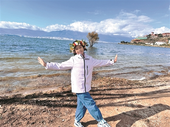 第二天一早拉开窗帘,我当场惊呼——洱海碧波粼粼,阳光洒在湖面,像坠入水中的繁星在跃动,又似银色小鱼在欢快地游动。早餐后,我们沿着洱海湖畔前往三塔寺。湛蓝的湖里,小黑鸭自在游弋,小船划过留下浅浅水痕,宛如一幅悠然展开的水墨画卷。妹妹突然大叫:“海鸥!”一群白鸥正盘旋飞舞,司机说它们是从遥远的西伯利亚来过冬的。海菜花静绽水面,像害羞的小仙子,偶尔被低飞的海鸥惊扰,漾起浅浅涟漪。