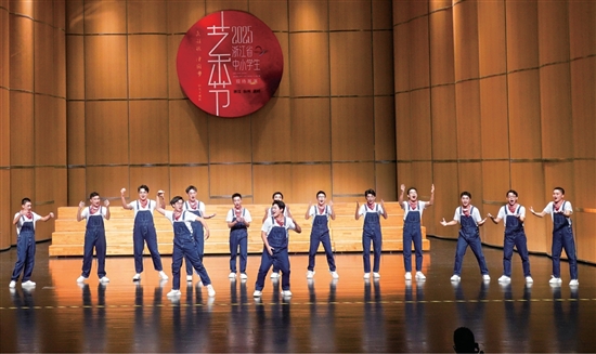 温州中学的表演则走出了独特风格。清一色男生组成的“探险小队”,穿着蓝色背带裤一亮相就吸引全场目光。他们演绎的不仅是一首歌,更是一出戏。学生们扮演被派往世界各地的探险队员,在执行未知任务的过程中,穿插了“搓背”“扔东西”等幽默动作,引得观众笑声不断。