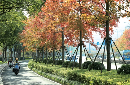 随着冬季的到来,市区体育场路两旁的枫香树褪去往日的青葱,换上了艳若红霞的“冬装”,美不胜收。进入该路段,仿佛置身于童话世界。