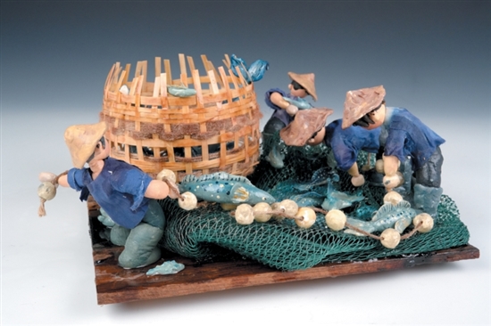 整件作品采用夸张化的手法,将鱼篓放大,且鱼篓中有着各种各样的大鱼,撒开的大网中还散落着未装的小鱼。船板上站着四位渔民:一位高举手臂,仰头欢呼,向大海表达感激之情;三位弯腰俯身,双手小心翼翼地捡拾渔网上的鱼,表达出劳动后的满足与喜悦。