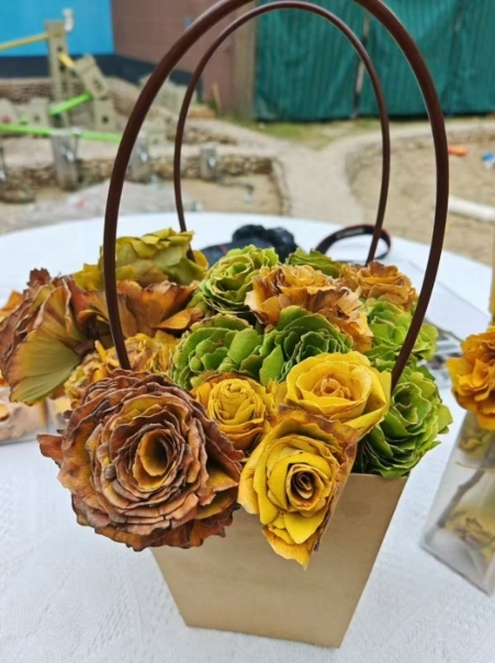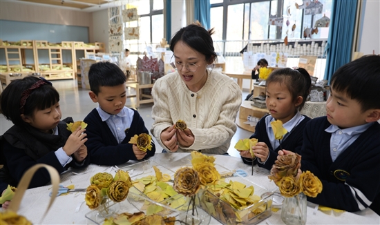 12月2日,太平街道中心幼儿园坊巷里园区内童趣盎然。老师带领孩子们收集金黄的银杏叶,通过折叠、粘贴等手法将落叶打造成精致“玫瑰”,在动手实践中感受自然之美,让美育教育扎根生活场景。