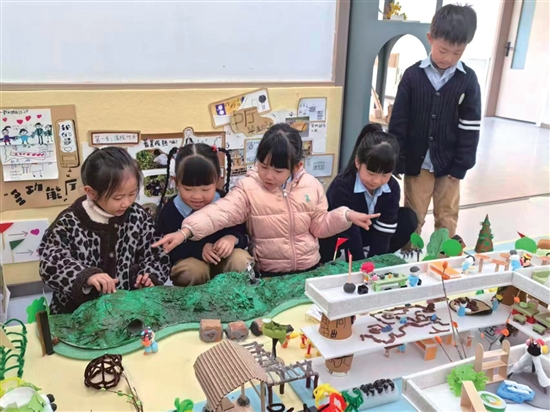 本报讯(通讯员郭盛昂文/图)“大家快看!这是我们每天做早操的操场,旁边的小旗子是我和老师一起插的。”“还有这个滑滑梯,我们用小木板做了台阶,和幼儿园里的一模一样。”近日,城东街道中心幼儿园,一场别开生面的沙盘介绍活动正在进行。孩子们围在精心搭建的“幼儿园全景沙盘”旁,化身“小小讲解员”,兴致勃勃地向来访的老师和同伴们介绍沙盘中的每一处景致。