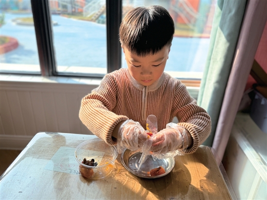 本报讯(通讯员张露丹文/图)冬意渐浓,风拂衣角,东部新区幼儿园金沙园区大(2)班的教室里却暖意流淌、甜香弥漫。近日,该班以“冬藏”为主题开展了一次别开生面的食育劳动实践活动——“柿子酱行动”。孩子们将自然角里剩余的柿子,熬制成一罐罐金黄透亮、饱含阳光味道的柿子酱,在实践中感悟节令、体验收获,把秋天的馈赠转化为冬天的温暖。