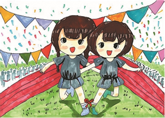 我和张胡媛对视一眼,不约而同地向对方跑去。我从许老师手中接过红绳,蹲下身,小心翼翼地将我俩的腿绑在一起。绳子系紧的那一刻,我们仿佛真的成了“连体婴”。当我们还在练习的时候,男生组已经热火朝天地开始了比赛。“一二,一二。”有的组像两只笨拙的小企鹅,一摇一摆地向前挪动;有的组像两只活泼的小兔子,一蹦一跳的,引得大家哈哈大笑。每个人都使出浑身解数,奋力向终点冲去。