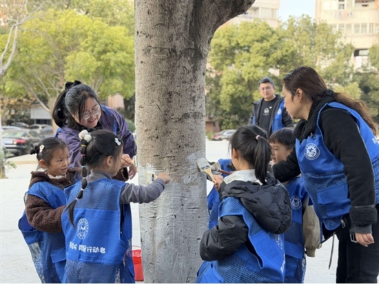 小小刷子遇见大大梦想,太平街道三星社区和三星幼儿园的萌娃们一起给树木穿“冬衣”。