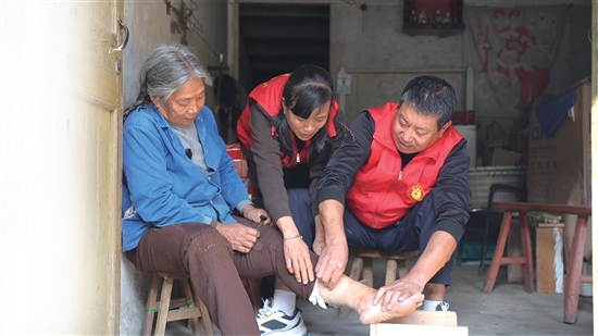 林新方和戴香英上门给独居老人金阿婆按摩腿部。