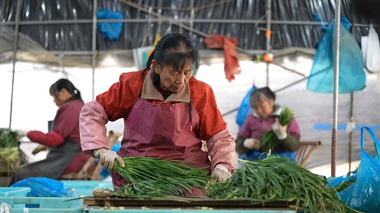 本报讯(记者辛雨咛 通讯员江文辉/文 记者王博/图)“我们两口子每天能拣两三百斤韭菜!”“我以前干过不少活,还是在这里最方便。”连日来,箬横镇严家桥村的胜日果蔬家庭农场内聚集了十余位村民,大家埋头仔细挑拣韭菜,棚内不时传出欢声笑语。