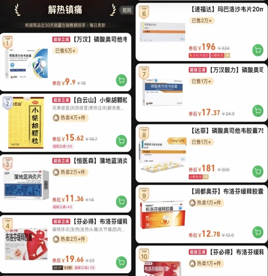 伴随流感高发,相关治疗药物销量急剧上升。近一周,奥司他韦销量暴涨237%,玛巴洛沙韦(速福达)涨幅达180%;11月解热镇痛类药品成交额环比增长超13倍,部分明星抗流感药物成交额增幅甚至超20倍。值得关注的是,“万汉”磷酸奥司他韦胶囊单平台销量已超5万单。