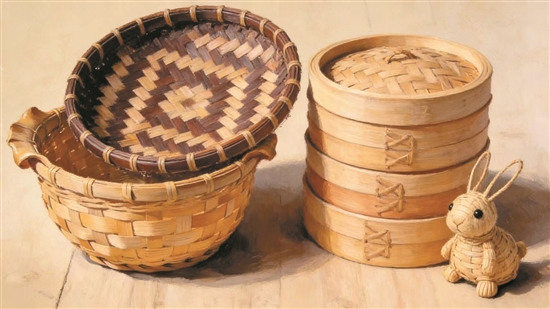 现在虽然有了塑料筐(kuānɡ),但竹编物件更环保呀!下次逛集市时,找找有没有竹编的小篮子,说不定能遇到正在编竹器的师傅哦!