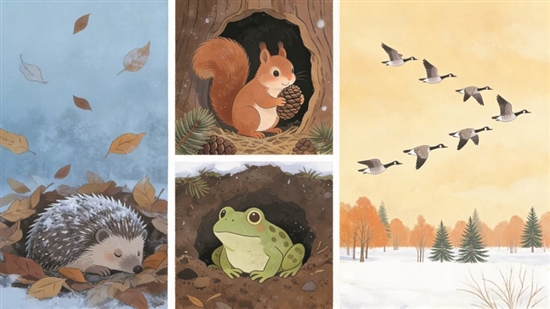 冬天食物少,寒风冷,小动物们有自己的“保命绝招”:青蛙、刺(cì)猬(wei)会钻进泥土里睡大觉,不吃不喝直到春天,这叫“冬眠”;小松鼠早就藏好了松果,饿了就拿出来吃;大雁最聪明,会飞到温暖的南方过冬,等春天再飞回来。