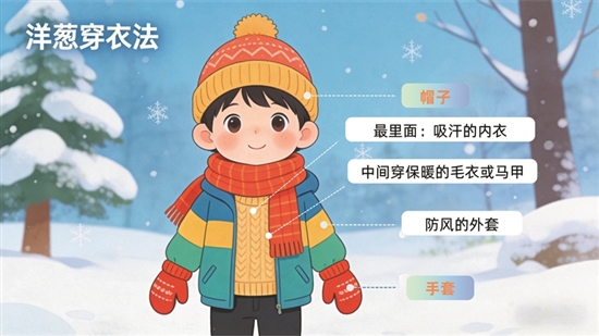1.穿衣有技巧:就像剥(bāo)洋葱一样,我们可以穿“三层衣”——最里面穿吸汗的内衣,中间穿保暖的毛衣或马甲,最外面套(tào)防风的外套,热了还能一层层脱掉,这就是“洋葱穿衣法”哦!头部、脖子和脚最容易散热,出门一定要戴帽子、围巾和厚手套呀。