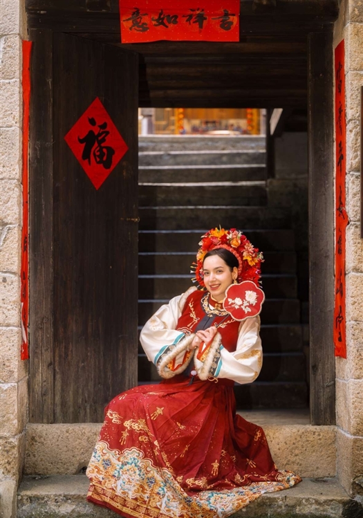外国游客在石塘体验簪花。