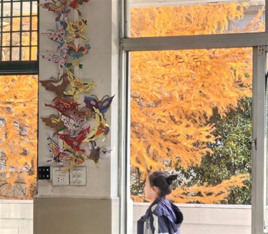 要是上午站在教室外的阳台上抬头望,准会惊得眨眼睛——这棵水杉像被秋婆婆施了魔法!层层叠叠的叶簇顺着粗实的树干铺展开,阳光一裹,就泛着暖融融的柔光。风轻轻一撩,满树金黄便漾开细浪,“沙沙”的声响裹在风里,像谁在低声哼歌。