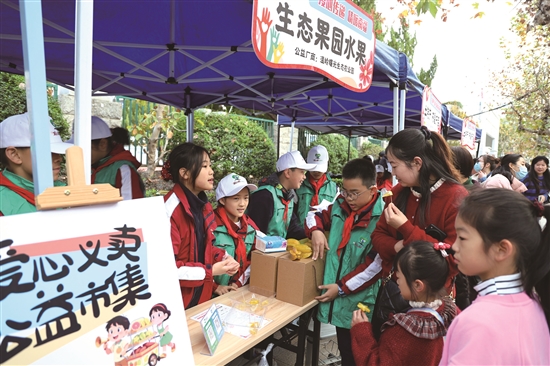 还没到校门口,远远就望见人行道上人头攒(cuán)动,一个个摊(tān)位被围得水泄(xiè)不通。各式商品琳(lín)琅(lánɡ)满目:醇(chún)厚(hòu)的老酒、香甜的红糖、新鲜的水果、暖和的棉鞋、诱人的零食……志愿者们热情地吆(yāo)喝(he)着,细致地介绍着,忙得不亦乐乎。介绍、装袋、收钱、找零——他们手脚麻(má)利(lì),生意一单接着一单。大家忙得热火朝天,脸上却都挂着开心的笑容。