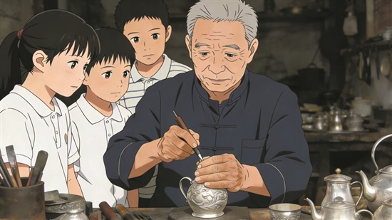 最考验手艺的是“敲打”和“打磨(mó)”!师傅拿着小小的锤(chuí)子,对着锡坯(pī)轻轻敲打,一下一下把壶嘴、壶把敲得服服帖帖(tiē)。比如做一把小酒壶,要把壶身敲得圆润(rùn),壶嘴敲得笔直,还要钻上小孔让酒流出来。敲好后,用细砂(shā)纸反复打磨,锡器就会变得亮亮的,像镜子一样能照出人影!