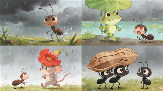 一天,天空阴沉沉的,小蚂蚁出来找吃的。突然,乌云密布,顽(wán)皮的雨滴落了下来,落到了草地上,水花四溅(jiàn),溅到了小蚂蚁的身上。小蚂蚁很后悔,不应该不看天气就出来,急得都快哭出来了。