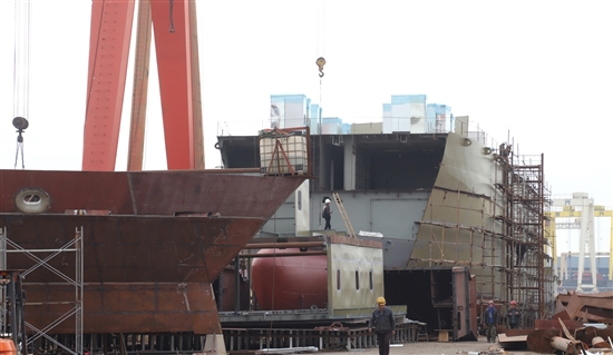 12月23日上午,在浙江腾龙造船有限公司科考船正在建造中。