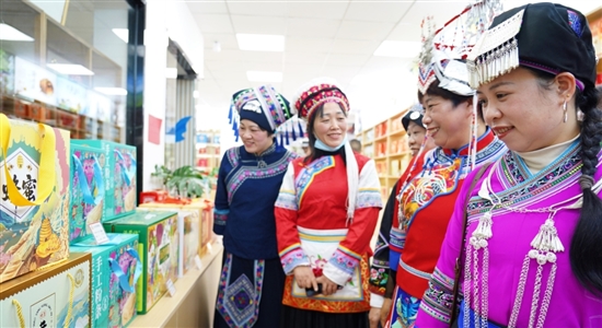 各族妇女代表在德广石榴红家园参观产品展销功能区。