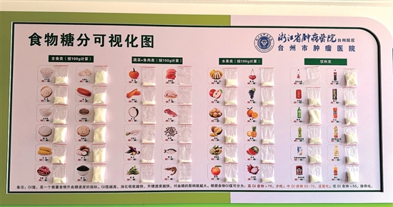 本报讯(通讯员陈巧/文 程妮娜/图)“原来荞麦面含糖这么高!”“白馒头居然比米饭升糖还快?”……近日,浙江省肿瘤医院台州院区(台州市肿瘤医院)心血管内科病区的宣教墙前,总是围满了驻足观看的患者与家属。大家对着新张贴的食物糖分可视化图议论纷纷,时不时发出恍然大悟的感慨。