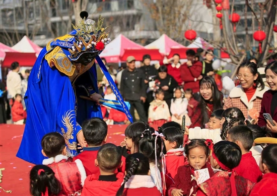 本报讯(记者程以琳/文 周学军/图)红灯笼高挂,古装萌娃穿梭,空气中糖葫芦的甜香混着糖画的焦香……这不是古装剧片场,而是市中心幼儿园“马年迎新·庙趣横生”元旦庙会的现场。近日,太平街道月河天地文化街区变身“迷你古市集”,1500余名师生、家长共赴一场“穿越”之旅。