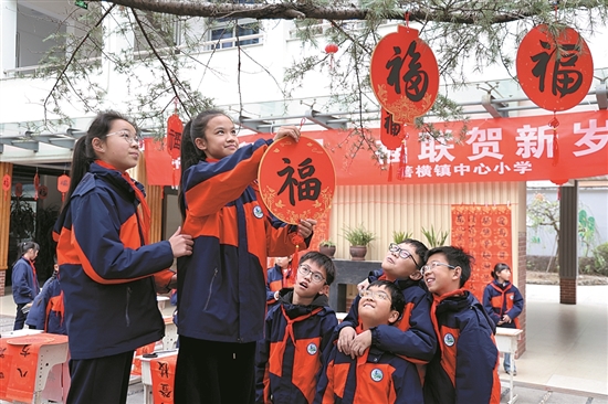 2025年12月24日,箬横小学书法广场墨韵十足,该校书法社团的学生们齐聚于此,开展“翰墨迎元旦,福联贺新岁”主题书法创作活动。学生们铺展红纸、研墨挥毫,专注地书写各式字体的“福”字与富有年味的楹联,并将作品张贴或悬挂于校园里,传递新年的美好祝愿。