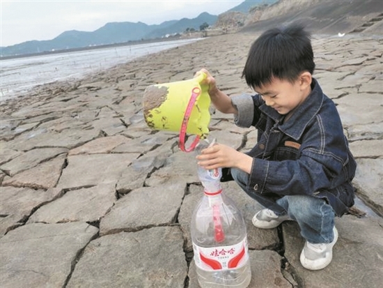 来到沙滩水洼处,利用浮游生物网取水洼底部的海水,装入对应标签的矿泉水瓶中。走到滩(tān)涂(tú)水域(yù),用同样的方法采集海水样本。