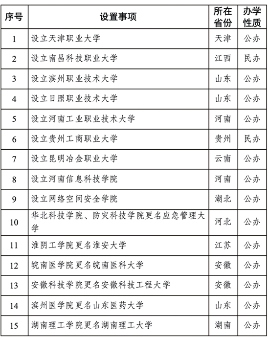 1月4日,教育部官网发布关于拟同意设置本科高等学校的公示:根据《中华人民共和国高等教育法》《普通高等学校设置暂行条例》《普通本科学校设置暂行规定》《本科层次职业学校设置标准(试行)》等有关规定,经教育部党组会议审议,拟同意设置天津职业大学等15所学校,现予公示。
