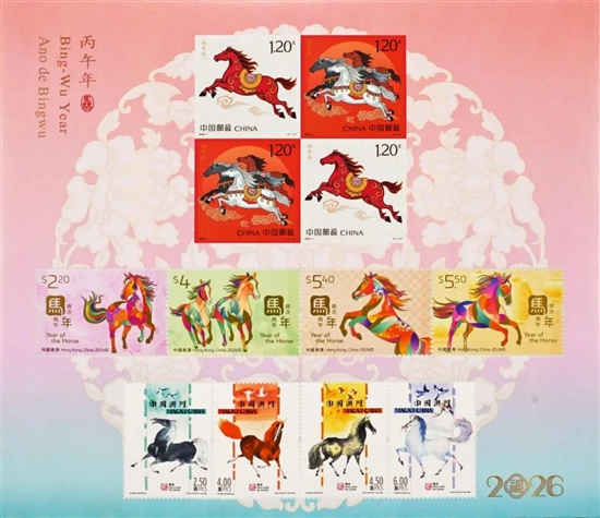当天,中国邮政携手港、澳邮政部门共同印制的生肖同题材邮票三地小全张同步揭幕。自1月5日起,消费者可以在全国指定邮政网点、中国邮政网上营业厅、中国邮政App、中国邮政微邮局公众号和中国邮政商城微信小程序购买《丙午年》特种邮票。