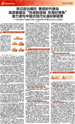 同志们,2025年已经过去,“十四五”圆满收官。回首温岭这五年,发展极不寻常、奋斗极不平凡。五年来,我们始终牢记政治嘱托,紧扣习近平总书记对浙江“4+1”重要要求,以及总书记在浙江工作期间4次到温岭考察调研作出的6方面重要指示批示精神,深入践行“八八战略”,加快建设“两城两湖”,坚定不移沿着总书记指引的方向奋勇前进,忠诚底色越擦越亮;五年来,我们始终扭住发展主题,地区生产总值迈过3个百亿台阶、接近1500亿元,预计人均地区生产总值从8万元提高至10万元,城乡居民收入倍差从1.80缩小至1.69,常住人口城镇化率从61.5%提升至69%,全国百强县排名从第25位攀升至第18位,综合实力不断壮大;五年来,我们始终坚持改革创新,全社会R&D经费支出占GDP比重从1.6%提升到2.59%,全日制普通高校、省重大创新平台、省顶尖人才均实现“零”的突破,浙东工业母机、金台丘陵山区农机装备列为国家先进制造业集群,上市企业数量达13家,龙门港区口岸正式开放,17项改革入选省部级以上试点,发展动能加速集聚;五年来,我们始终把牢实干导向,打响了全域土地整治、低效用地改造、湖漫库区生态搬迁等一场场大仗硬仗,市域铁路S1线、市文化中心等一批重大民生工程建成投用,三甲医院数量居全国县(市、区)前列,接连捧回“天工鼎”“平安鼎·铜鼎”“神农鼎·银鼎”“大禹鼎·银鼎”,创成“全国文明城市”“全国双拥模范城”,干事氛围更加浓厚。