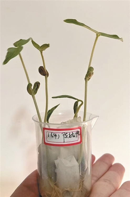 科学老师让我们观察绿豆的发芽,刚开始这些小豆豆们都小小的,硬硬的,穿着绿色的外套。我把它们放进透明的密封(fēnɡ)袋里,还加了一些水,第二天早上,我兴奋地跑去看豆子。哇!它们变得胖乎乎的,颜色也变浅了一些。最神奇的是,每颗豆子都冒出了一点白白的“小尾巴”。妈妈告诉我,那是胚(pēi)根。第三天,豆子们又长大了一圈,胚根变得更长了,弯弯扭扭的。到了第四天,有趣的事发生了,豆子们脱掉了外套,光溜溜(liū)的。还长出了嫩绿的小叶子!为了帮助它们更好地生长,妈妈帮我做了一个观察杯,先在透明杯子里放上纸巾,再放点泥土,小心地把种子放进去,还给它们浇了水。搬家以后它们看起来更精神了!小叶子都变绿了,根也变得更长,还长出了细细的分支。就像老爷爷的白胡须(xū)。又过了一天,豆芽们都长高啦!我还发现一个秘密:所有豆芽的叶子都朝着有光的方向生长哦!原来植物真的会追太阳!