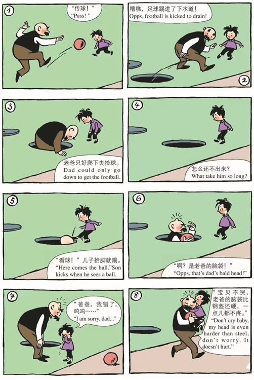 爸爸从井里爬上来,拍了拍身上的灰,看见儿子哭得稀里哗啦,便弯下腰,一把将他抱了起来。用额头轻轻碰了碰儿子的小脸,笑着说:“儿子,别哭,老爸的脑袋比钢盔(kuī)还硬,一点儿也不疼!”儿子抽抽搭搭地摸了摸爸爸头上那个小包,终于破涕(tì)为笑。