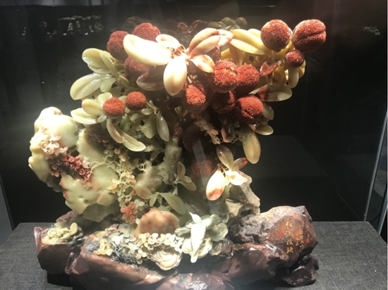 当天,观展者络绎不绝,纷纷驻足展柜前欣赏,有的观众不时用手机拍摄作品,精妙的雕艺引得众人啧啧称叹。比如,以封门红花石刻制的《红满枝头》,生动呈现了杨梅成熟时的情景,颗颗杨梅栩栩如生;用青田红花石雕琢的《五谷丰登》则通过低垂的高粱与稻穗,展现出形态逼真、色调谐美的丰收景象;以青田金玉冻雕刻的《人生如意》以人参(谐音“人生”)和如意状灵芝为题材,人参根须的雕琢巧夺天工。人物、花卉、山水……周李光的作品题材广泛,均因材造型、因色施艺。他曾自述,青田石雕声名远播,皆在一个“镂”和“色”字上。“镂”是精镂细刻,层次丰富;“色”是因色施艺,形象逼真。对照他的一件件作品,即可体味“镂雕”这一青石石雕最具特色的技艺之妙了。