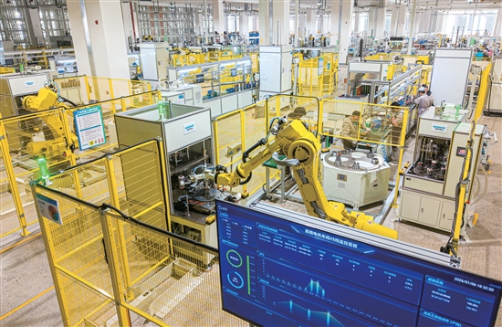 走进企业车间,智能化生产场景随处可见:21米高的成品立库矗立其间,6.6万个货位通过400多米智能输送链与生产线无缝衔接,红外线扫码自动溯源、AGV小车穿梭转运,从产品下线到入库存储实现无人化作业,大幅提升了订单周转效率。电机车间内,10多条自动化产线搭配20多台智能机器人,实现了绕线、嵌线、整形、绑线等多个环节无人化,用工减少60%,生产效率提升80%,产品合格率达到99.8%以上。