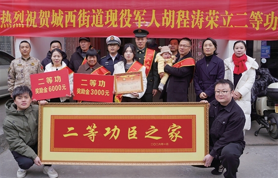 本报讯(记者叶琳 通讯员王双双文/图)青春砺剑铸军魂,一人立功全家光荣。日前,城西街道下岙村至温峤镇许宅村一带锣鼓铿锵、喜气洋洋,二等功臣之家牌匾与二等功喜报如期送达胡程涛及其家属手中。当天,市双拥办和城西街道还分别送上了奖励金。邻里乡亲闻讯齐聚,共同见证这一属于军人家庭的荣耀时刻。
