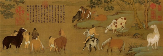 元代赵孟頫的《浴马图》(现藏于北京故宫博物院),绢本设色,纵28.1厘米、横155.5厘米,展现了一幅夏日溪边浴马的闲适图景。画面中,十四匹骏马形态各异、生动自然。有的立于水中,有的低头饮水,有的昂首嘶鸣,有的卧地顾盼,还有的相互嬉戏。九位奚官或挽缰、或拭马、或闲坐,神态悠然。赵孟頫秉持“书画同源”理念,用淡墨勾勒马的轮廓,再以赭石、花青渲染皮毛,线条流畅且富有韵律;背景的溪水、垂柳、远山则以水墨晕染,营造出“人在画中游”的意境。此画不仅是对马的写生,更是宋元文人“寄情自然”精神的写照。马与人的关系,从“役使”升华为“共生”,透露出超脱世俗的雅趣。