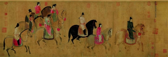 辽宁省博物馆藏张萱的《虢国夫人游春图》(宋摹本),虽非张萱原作,却完美承袭了盛唐绘画的华贵气韵。该画绢本设色,纵51.8厘米、横148厘米,描绘了杨贵妃三姊虢国夫人率侍从春日出游的场景。画面中,八骑九人缓辔而行,虢国夫人居中,身着淡绿长裙,外披白纱,骑一匹三花马(唐代御马标志),眉目间尽显雍容。其余侍从或执鞚、或随行,衣饰色彩明艳,马匹装饰华丽,连鞍鞯上的金饰都清晰可见。张萱以细腻笔触捕捉人物神态与服饰质感,更通过马的步态、鞍具细节,折射出盛唐社会的繁荣与贵族生活的精致,堪称“唐代风俗画的巅峰之作”。