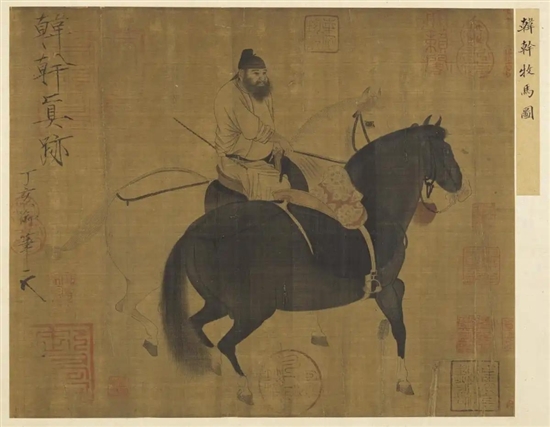 唐代韩幹的《牧马图》(现藏于台北故宫博物院),绢本设色,纵27.5厘米、横34.1厘米。画面构图简洁,勾勒出两匹骏马与一位奚官。左侧黑马昂首嘶鸣,鬃毛飞扬,肌肉线条如弓弦紧绷,尽显力量之美;右侧白马低头踱步,温顺中透着灵动,与黑马形成动静对比。奚官身着胡服,侧身牵缰,目光专注而松弛,人与马的关系在无声中达成默契。韩幹以“师造化”的写实手法,将马的骨骼、皮毛、神态刻画得纤毫毕现。正如杜甫所言“韩幹画马,笔端有神”,每一笔都跃动着生命的呼吸。